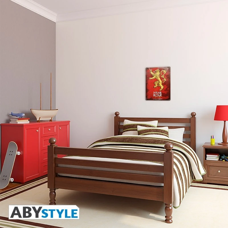 Game of Thrones Plaque Métal Lannister. Affichez dans votre chambre, bureau etc…la plaque métal de la maison Lannister de Game of Thrones. Le célèbre emblème du Lion et la devise de la maison sont ici représentés en relief cela ajoute un superbe effet à cette plaque Game of Thrones.